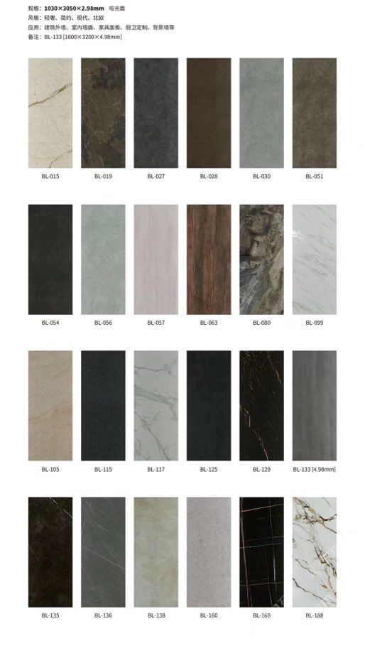 發(fā)布信息: ????SIBELAN 斯貝納巖板???? ????意大利設(shè)計(jì)師精選巖板???? 我們可以幫老總您加工為成品, 全國范圍內(nèi)可安排專業(yè)團(tuán)隊(duì)安裝. 做到您一次性采購 省心. 放心. 省時(shí). 低價(jià)! 巖板紋路版面全多達(dá)199 款 勵志做服務(wù)五星的巖板專業(yè)供應(yīng)商 魚肚白 雪花白 格蘭云天 寒江雪 爵士白 幻影灰 勞倫黑金 火山灰 亞馬遜 艾維拉 羅馬黑檀 貝特巖 細(xì)花白 羅馬灰 云朵拉灰 魚肚金 莎羅娜 莎羅蘭 勞倫白金 拉薩白 中花白 灰冰玉 卡拉拉白 撒金黑 清水玉 薩瓦灰 莎士比亞 大花灰 白冰玉 銀灰洞 阿瑪尼灰 綠紋玉 綠冰玉 藍(lán)紋玉 保加利亞灰 鐵銹 黑木紋 流砂灰 純白 純灰 純黑 TEL: 15905069590 聶 各種版面規(guī)格全部如下: 1200×600×11mm 啞光 1500×800×11mm 啞光 1800×900×11mm 啞光 1800×900×12mm 啞光 2600×800×15mm 啞光 2400×1200×6mm 啞光/亮光 2400×1200×9mm 啞光/亮光 2400×1200×15mm 啞光 2700×1200×6mm 啞光/亮光 2700×1600×12mm 啞光/亮光 3200×1600×6mm 啞光/亮光 3200×1600×12mm 啞光/亮光