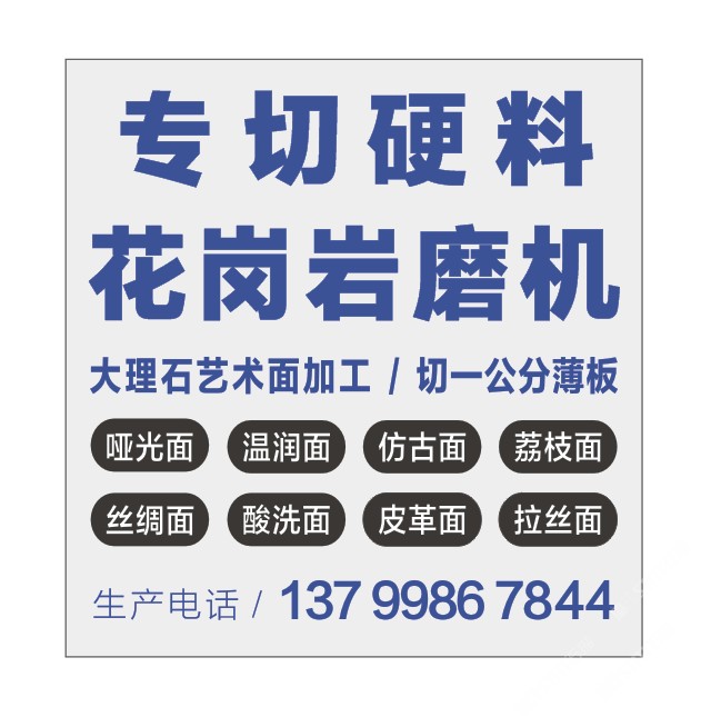 發(fā)布信息: 專切硬料 一公分薄板 花崗巖磨機 三臺靜壓拉鋸 一臺靖佑大理石磨機 一臺靖佑花崗巖磨機 意大利進(jìn)口磨頭 來料加工 大理石藝術(shù)面 荔枝面 皮革面 溫潤面 仿古面 地址在埭頭村 聯(lián)豐工業(yè)區(qū) 8 號 興業(yè)石材廠 鴻群生產(chǎn)加工中心 馮廠長 13799562486